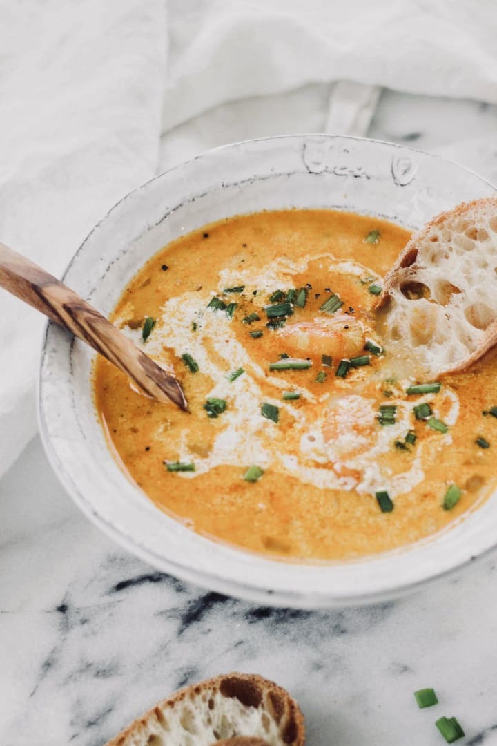 Shrimp bisque is a traditional Cajun dish. The soup is prepared with large shrimp, seafood broth, butter, bell peppers, shallots, garlic, flour, cream, brandy, hot sauce, and seasonings, The shrimp are simmered in the broth until liquid is reduced. The rest of the ingredients sauteed along with brandy and cream until thickened and the cooked shrimp are added, The soup is garnished with sliced green onions and parsley.