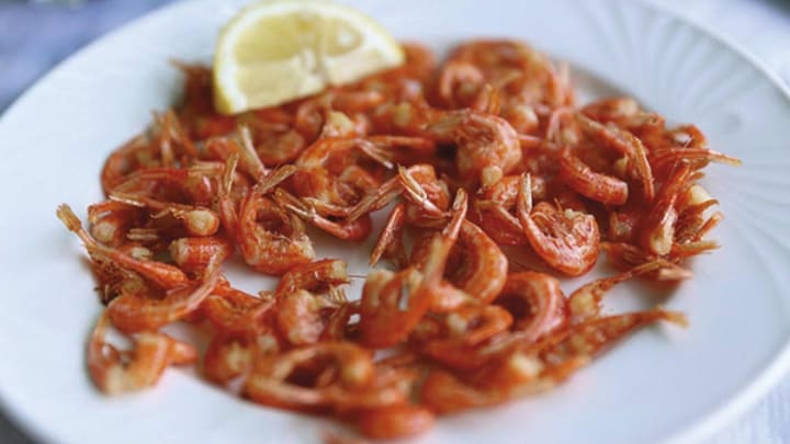 Simiako garidaki is a seafood delicacy of the Greek island of Symi. The dish is prepared with Symi shrimp a variety of tiny shrimp that inhabit the sea around the island, They are bright red and sweet and very flavorable. They are enjoyed crispy fried in olive oil and garlic and seasoned with salt and pepper. They are usually eaten whole including tails, shells, and heads.