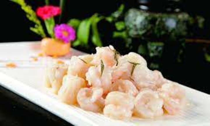 Fried shrimp with Longjing tea is a specialty of Hangzhou City. Large live shrimp are soaked in a marinade made with egg whites, cornstarch, and rice wine and then cooked in steeped Longjing tea. The tea is fragrant and refreshing with green shoots that complement the flavor of the white shrimp. The stir-fried shrimp is served hot or cold, drizzled with cooking liquid and seasoned with salt and pepper.