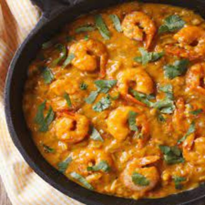 Chingri malai curry is a traditional curry that originated in the Bengal region. The curry is made with coconut milk and prawns that have been seasoned with garam masala spices and fried in ghee or mustard oil with onion, hot chilli peppers, garlic ginger paste, and turmeric. Additional ingredients that can be added include red chilli powder, cinnamon, sugar, and cardamon. The dish is cooked until the gravy becomes thick and creamy and served with rice on the side.