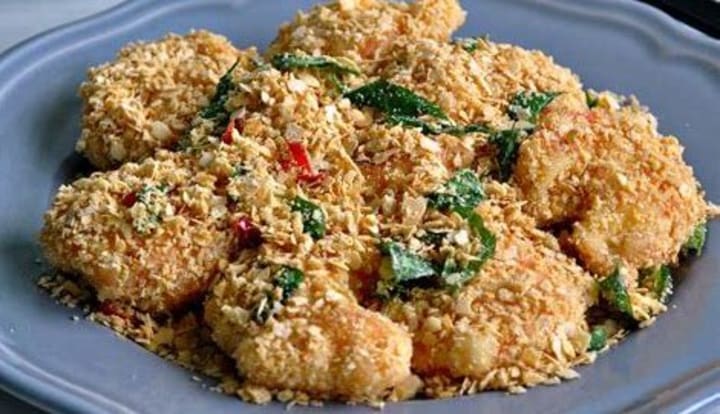 Cereal Prawns is a dish that is made with crispy fried prawns doused in a rich combination of butter, crushed and toasted cereals, curry leaves, and chillies. The prawns are served topped with toasted, almost sand-like cereals and enjoyed hot.