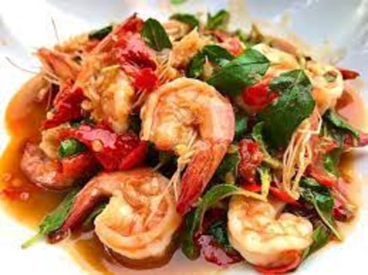 Kung thot krathiam phrik is a stir-fry that is prepared with shrimp fried with garlic and pepper and mixed with minced garlic, fish sauce, soy sauce, oyster sauce, sugar, and ground white pepper before stir-frying with the marinade mixture. The shrimp is served on a bed of jasmine rice with slices of fresh tomatoes and cucumbers on top and served alongside is a mixture of bird's eye chilli, fish sauce, garlic, sugar, and lime juice.