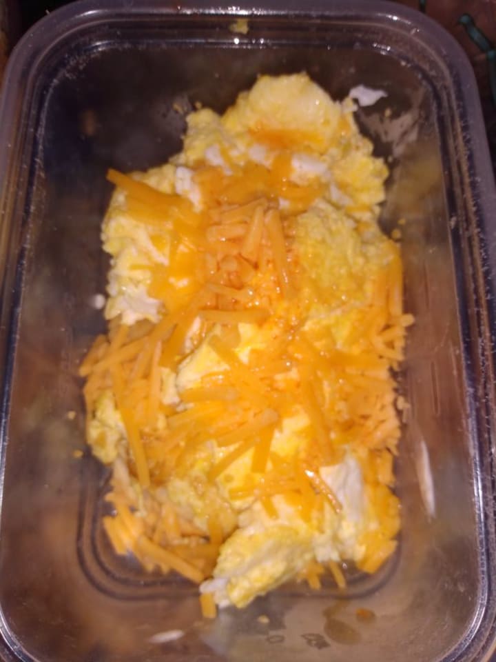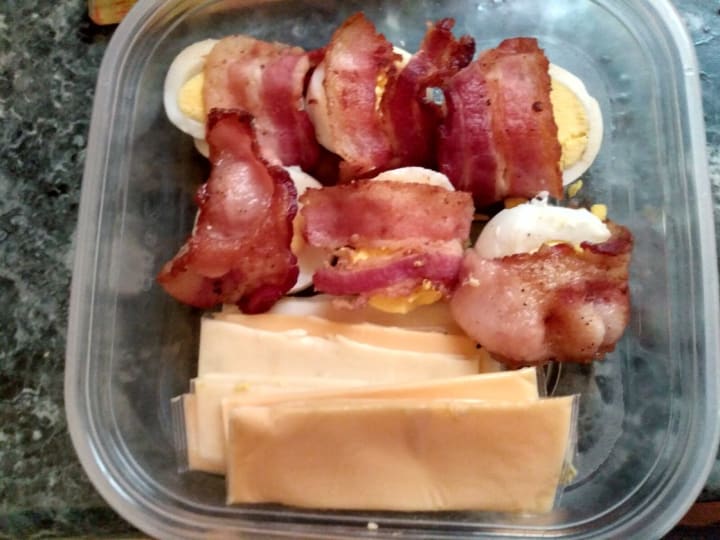 Bacon wrapped hard boiled eggs and cheese slices..to keep them from getting all icky..just slice them while in the wrapper and leave them there until lunch time.