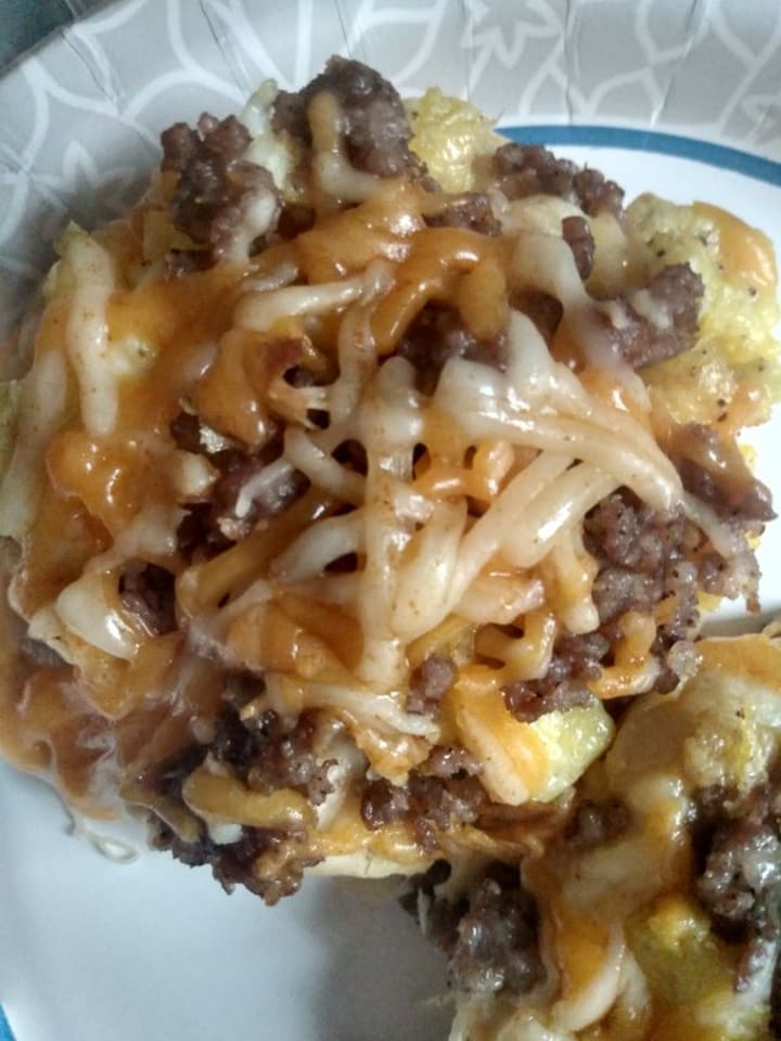 I added fried potatoes and bacon into the mix , along with some extra cheese ..cholesterol be damned .. you only live once. Add a second Grands biscuit on top, close and seal for the morning shift, or Breakfast at Midnight.. however you don't have to break out into Taylor Swift's 22, but dance like no one is watching, because seriously we don't live in Footloose.