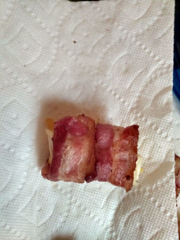 Quick and easy... Make an Omelet, lay sliced cheese of your choice- I used pepper jack on top ..Cut into either bite sized pieces to wrap with 1/2 a slice of bacon or larger pieces if the bit sized ones get to tedious for the impatient.