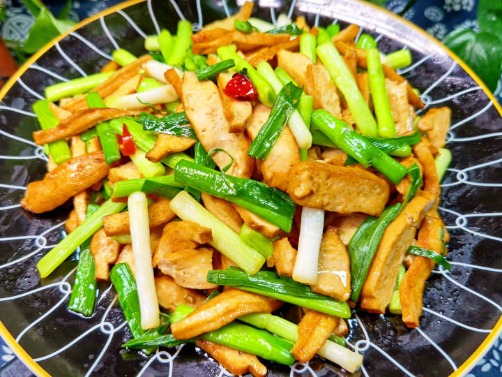 Garlic sprouts pack a pungent, antibacterial punch, while spiced tofu adds smoky depth. Together, they create a hearty dish that’s pure comfort in every bite.