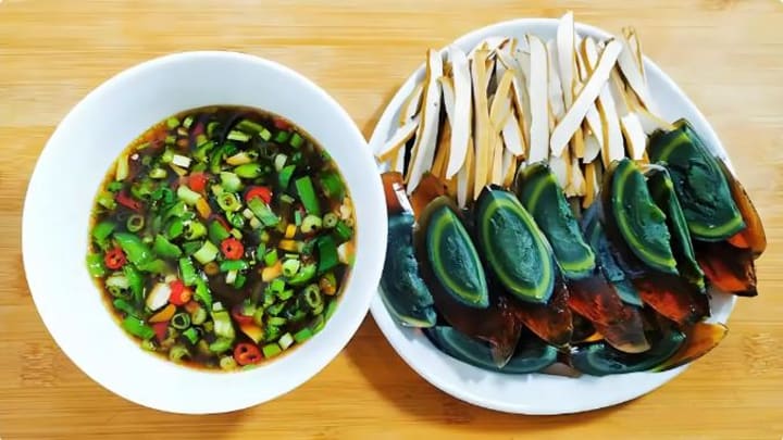 1. Century Eggs: Slice with dental floss (no knife stickiness) → blanch in boiling water for 10 sec to mellow sulfur notes.