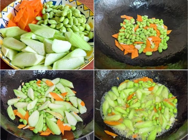 • Sauté minced garlic until golden. Stir-fry carrot dices until oil turns orange. Add edamame, stir 1 min. Incorporate loofah, pour ½ cup water, cover and steam 2 mins. Season with salt and reduce sauce.