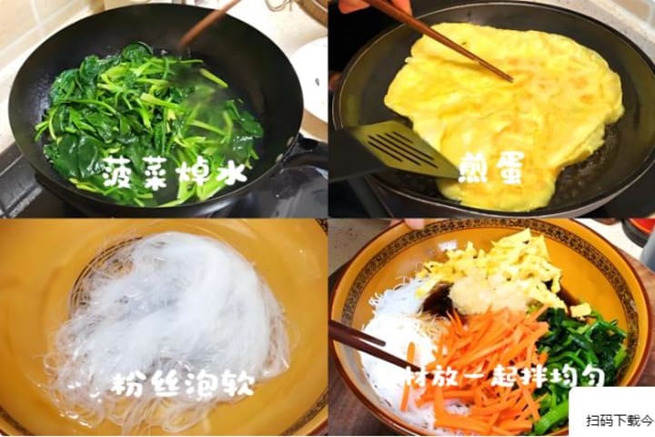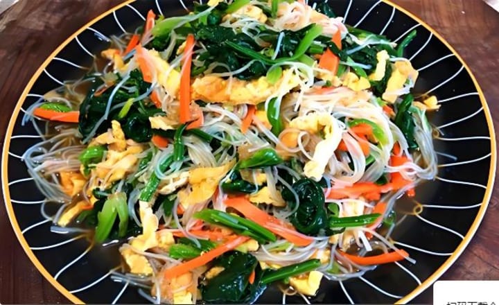 6. Combine all prepared ingredients—spinach, glass noodles, egg strips, and carrot—in a large mixing bowl. Pour the dressing over everything, then put on clean gloves and toss thoroughly, ensuring every strand of noodle and every leaf of spinach is coated in the delicious sauce.