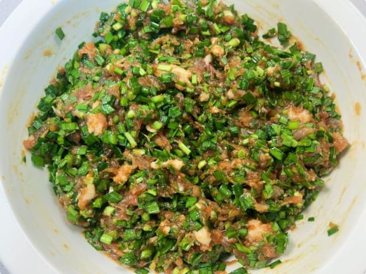 4. Incorporate Greens: Finely chop 200g (approx. 7 oz) of fresh Chinese chives (韭菜). Toss them lightly with 1 teaspoon of sesame oil before adding to the meat mixture. This oil coating helps seal in the chives' moisture and prevents them from making the filling watery. Gently fold the chives into the seasoned pork until just combined. Avoid overmixing.