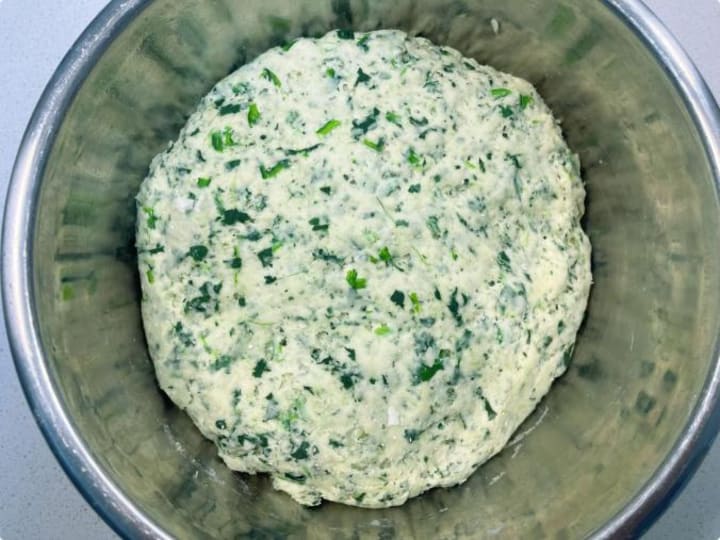 3. Mix & Knead: In a large mixing bowl, combine all-purpose flour, 1 teaspoon of instant yeast, and a pinch of sugar (the yeast’s "snack" to boost activity). Add the finely chopped spinach. Gradually pour in cool water (room temperature is fine in summer) while stirring with chopsticks or a fork until shaggy clumps form. Turn out onto a lightly floured surface and knead for 8-10 minutes until smooth and elastic.