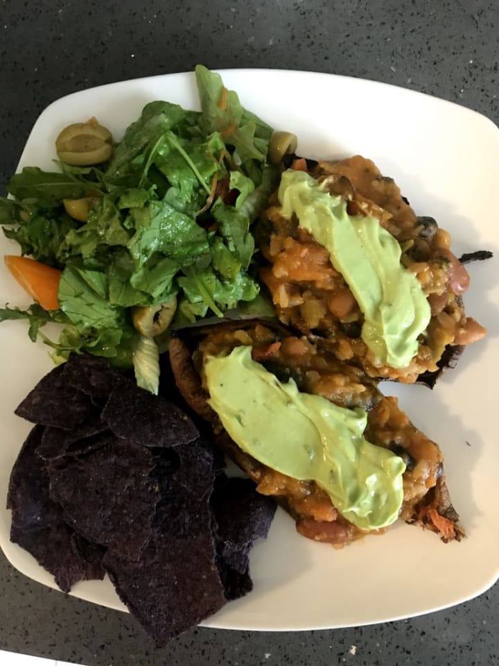 Step 9: Assembling your meal: Scoop chili carefully into the sweet potato skins. Dollop a generous amount of avocado-lime sour cream on top, and serve with a side of tortilla chips and a salad for a complete & comforting meal. (You might want to make extra avo-lime sour cream for dipping extra chips if you or your dinner guests are feeling indulgent!).