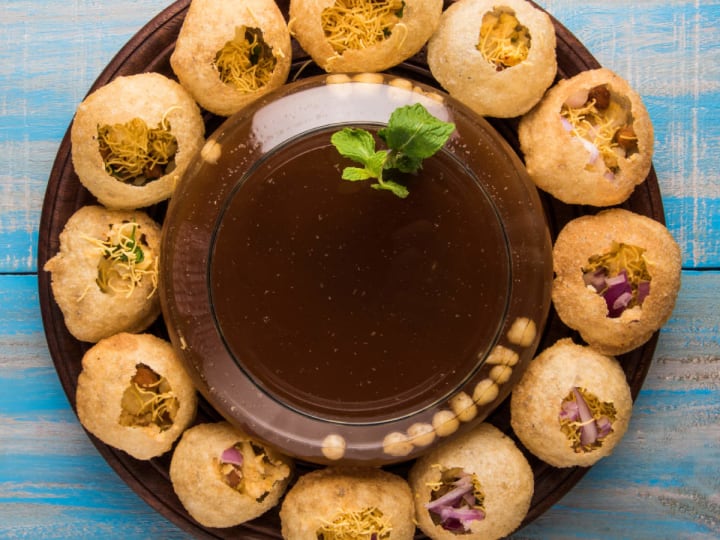 Panipuri is a very popular street food in India, Bangladesh, Pakistan, and Nepal. It consists of a hollow puri that is fried until crisp and stuffed with a mix of flavored water called pani, tamarind chutney, chaat masala, potatoes, onions, hot chilis, and chickpeas. In Northern India, panipuri is called golgappa which refers to the crispy shell and gappa to the eating process.
