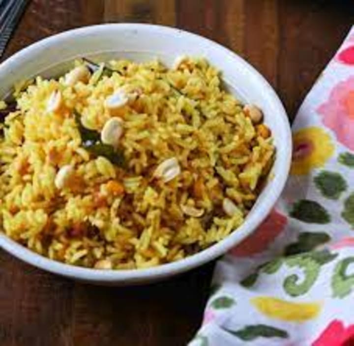 Pulihora is a curry dish that is prepared with rice, turmeric, tamarind, curry leaves, coriander, ginger, and green chillies enhanced by yellow lentils, roasted sesame seeds powder, and mustard seeds.