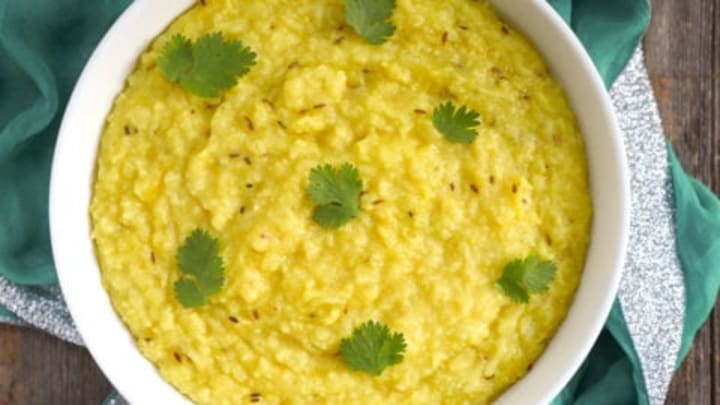 Khichdi is a South Asin dish made with rice and lentils. To enhance the flavor spices like cinnamon, cloves, bay leaves, and peppercorns are added.