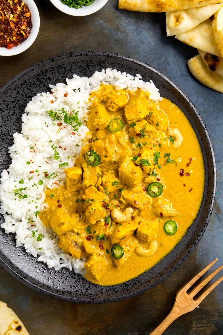 Korma is a creamy stew that can be made vegetarian or with meat added. It is prepared with saffron, yogurt, and spices like coriander, ginger, cumin seeds, chillies, and turmeric. It is mostly eaten with flatbreads. Ingredients can include coconut, coconut milk, almonds, cayenne pepper, and fennel seeds.