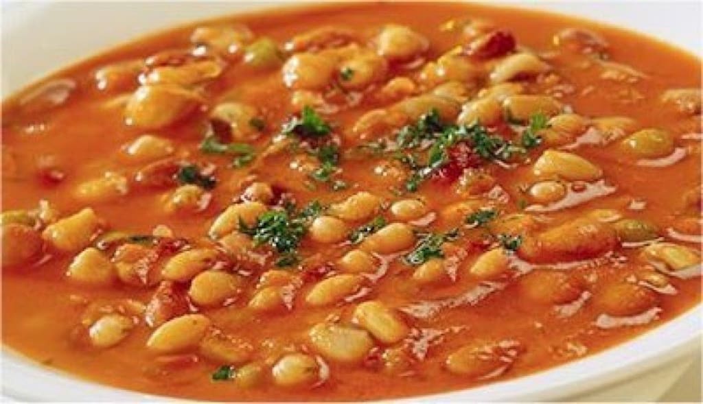 Fasolada is a traditional Greek soup that is made with dried white beans drizzled with olive oil. The soup is eaten with different vegetables and herbs like onion, celery, and tomatoes. Prepare the soup by heating olive oil in the soup pot and add chopped onions, carrots, celery, and sliced garlic and sauté for a couple of minutes. Add tomato paste, tomato sauce, and crushed tomatoes with herbs and spices, and mix with white beans and broth. The soup is simmered for about half an hour until the vegetables are tender.