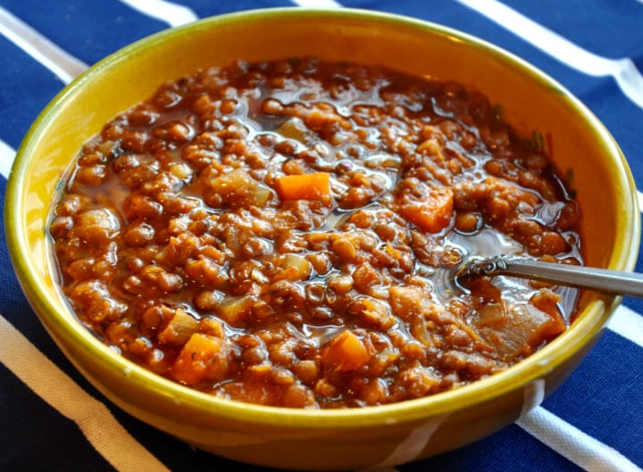 Fakes, a traditional Greek lentil soup, is prepared with green or brown lentils, onions, garlic, carrots, and at times pureed tomatoes. The soup is served topped with olive oil and vinegar and is usually enjoyed as a winter meal with bread.