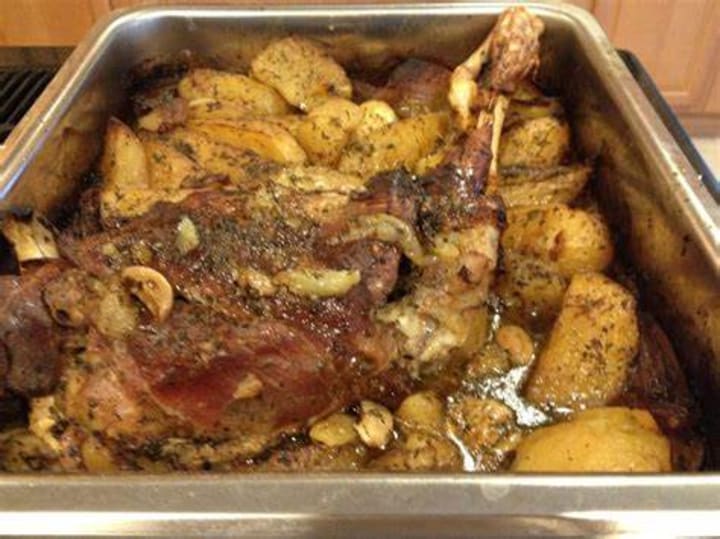 Greek roasted leg of lamb is a classic with a leg of lamb roasted with potatoes. The leg of lamb is first marinated and seasoned with olive oil and fresh herbs. It is usually prepared for special occasions and served drizzled with lemon juice.