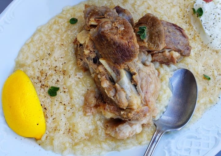 Gamopilafo is a complex dish combining meat like goat, lamb, veal, chicken, or pork with rice. The meat is cooked separately, and then the meat broth is used for cooking the rice, which is flavored with lemon juice and butter. When served, the meat is sliced and placed on top of the rice. The dish is accompanied by lemon wedges.