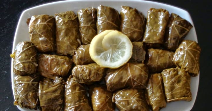 Phylla, means leaves in Greek. The dish is prepared with vine leaves stuffed with ground beef and pork, rice, onions, tomatoes, salt, and pepper. When the vine leaves have been stuffed, they are placed in a large pot over a layer of vine leaves and tomato slices with water or stock and lemon juice, then cooked until tender. The dish is traditionally served with a dollop of Greek yogurt on top.