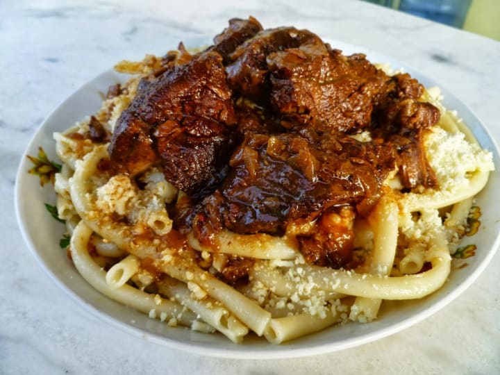 Pastitsada is made with cuts of rooster or beef. The meat is seared and sauteed in a delicious tomato-based sauce with onions, garlic, olive oil, wine, and spices like nutmeg, cinnamon, and cloves. It is traditionally served over penne or spaghetti and topped with grated cheese.