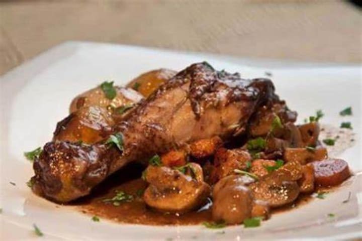 Kouneli stifado is a traditional stew with browned pieces of rabbit meat cooked with onions, tomatoes, tomato paste, garlic, red wine or red wine vinegar, chicken or rabbit stock, and olive oil. For flavor, spices like cinnamon, bay leaves, allspice berries, oregano, rosemary, cumin, salt, and pepper are added. The dish is served with freshly ground black pepper grated on top.