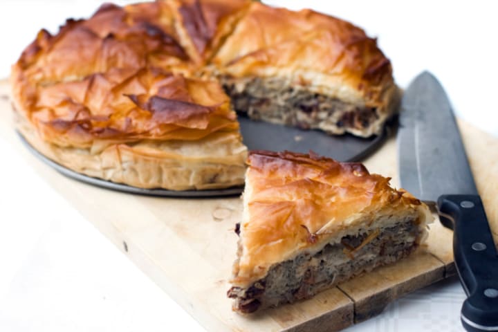 Kreatopita is a meat pie that combines flaky phyllo dough with ground meat. The filling can include rice, leeks, cheese, bechamel sauce, and seasonings.