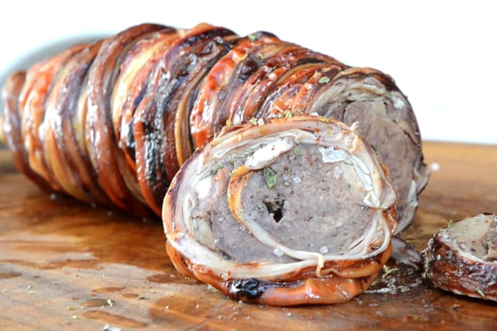 Kokoretsi is a dish made with lamb or goat offal chopped in tiny pieces, seasoned with lemon juice, olive oil, salt, and pepper. The offal is skewered, covered with caul fat, and cooked over charcoal. It is consumed as an appetizer or meze on Easter Sunday.