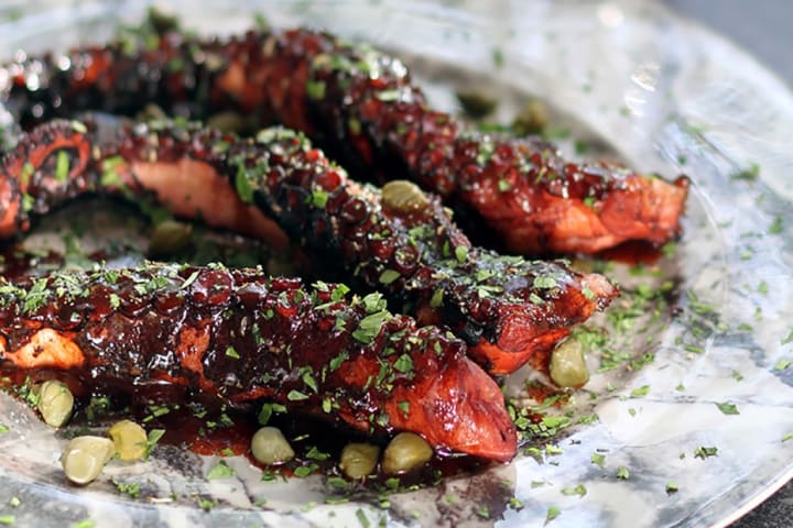Grilled octopus is a classic dish. The octopus is cooked and then grilled over charcoal. It is served thinly sliced and seasoned with olive oil, a drizzle of lemon, and oregano.