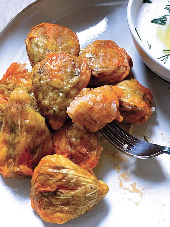 Greek-style stuffed squash flowers are filled with rice or cheese and different spices and herbs. Once stuffed, the blossoms are slow-baked in the oven. They can be accompanied by yogurt on the side.