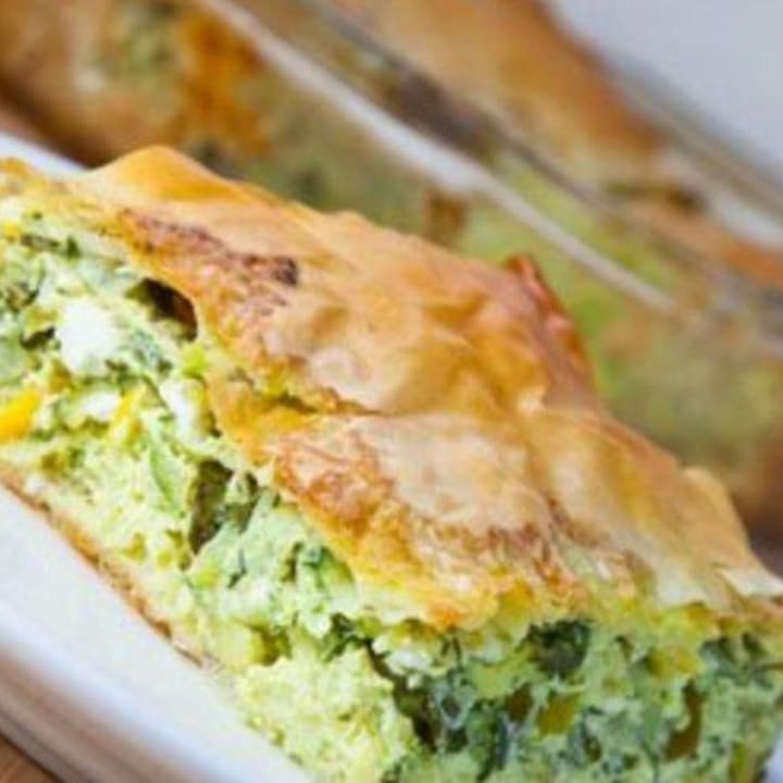 Kolokithopita is a savory Greek pie with a filling of zucchini and feta between two layers of phyllo pastry.