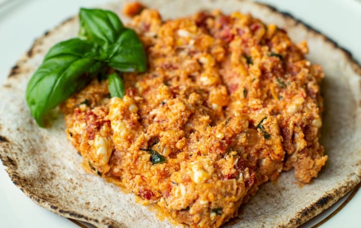 Strapatsada is made with diced sauteed tomatoes seasoned with fresh herbs. The tomatoes are combined with lightly beaten eggs, and topped with crumbled feta cheese.