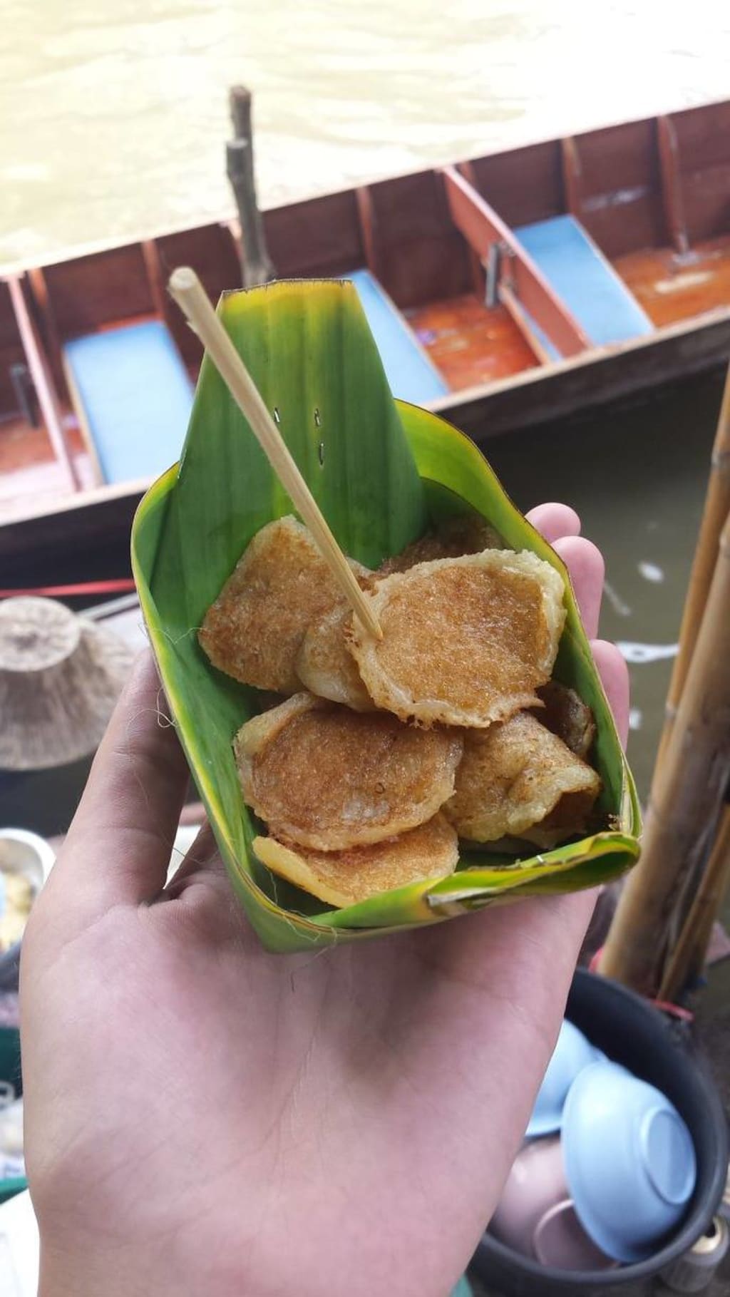 I asked the person next to me, and they told me that these were Thai coconut pancakes made with coconut sugar. They pointed me towards another boat on the river that was selling pucks of coconut sugar that was used to make them. Of course I went and bought a small pack of the sugar pucks to take home with me.