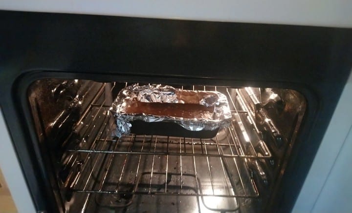Grease and flour a baking dish. Which I didn't want to do so I put aluminum foil but now that I reflect on this substitution I realize that no baking recipe ever calls for aluminum foil and there must be a reason for that and I'm about to learn it in 30 minutes to 1 hour.