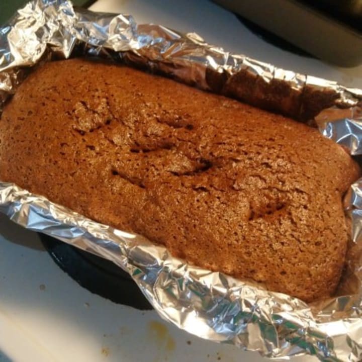 Visuals. 7/10. Turns out there's actually nothing wrong with using aluminum foil for a cake - it still bakes the cake and doesn't alter the flavour in a perceptible way. It just changes the visual aesthetics of the cake because of the rounded corners. Also because I baked it in a bread tin it looks like bread.