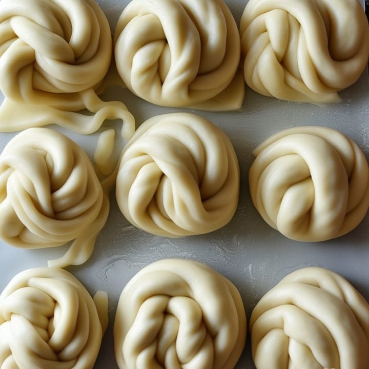 Divide into 80g portions. Roll into 60cm ropes—thick in center, tapering to pencil-thin ends. Form classic pretzel shape: