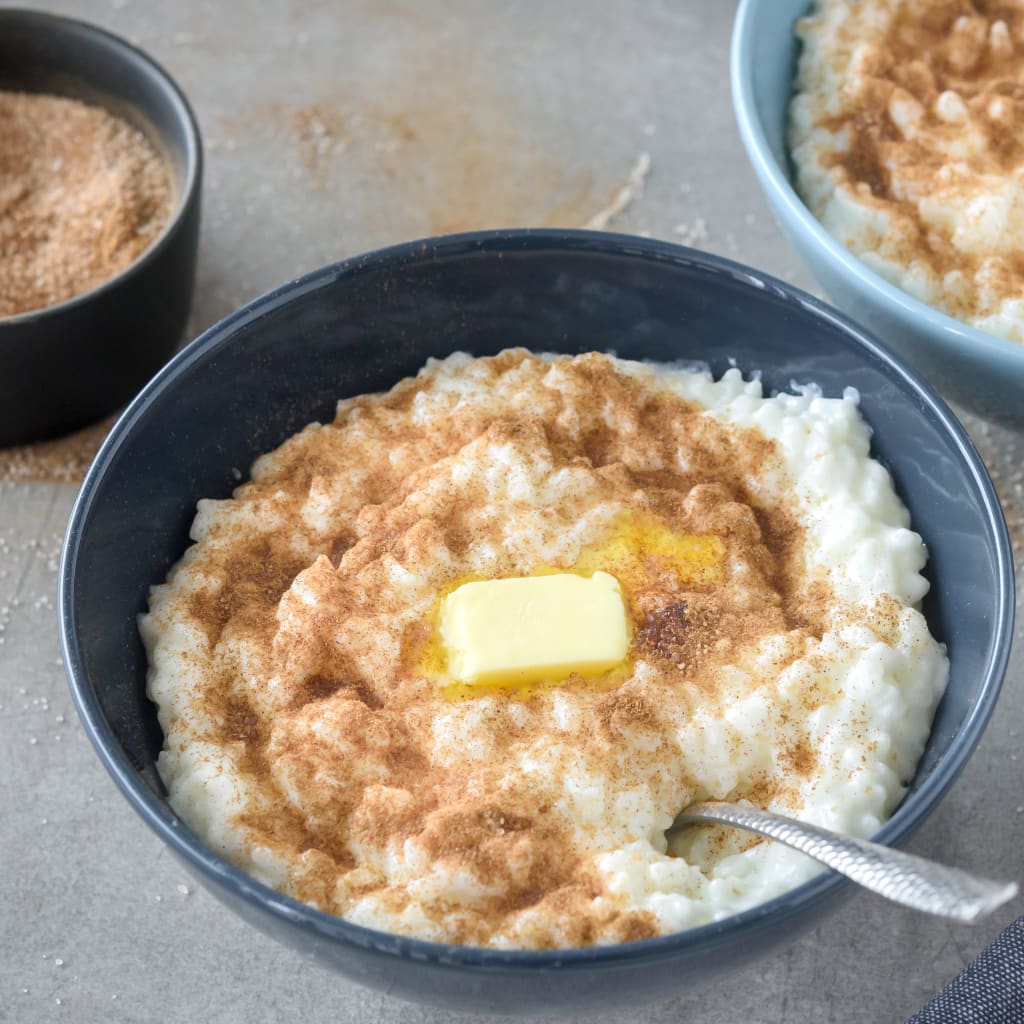 The rice is stirred continuously until it becomes a thick and creamy pudding, When put into bowls cinnamon sugar is sprinkled on top with a dollop of butter. It is a delectable treat.