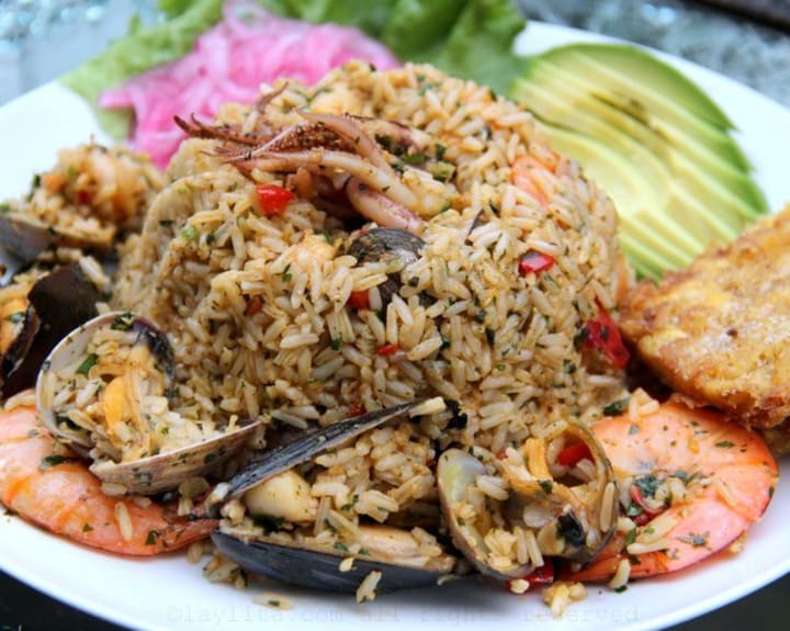 Arroz Marinero is a delicious dish with the main ingredients being seafood and rice. The dish is created by adding sauteed vegetables like onions, peppers, tomatoes, and garlic to the seafood and rice and simmering in water or stock and adding different spices and seasonings,