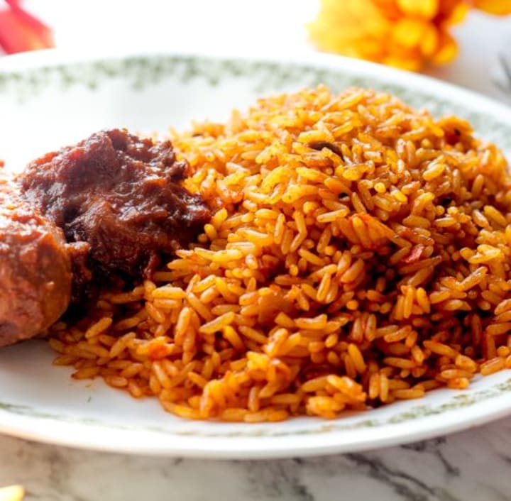 Jollof rice is Nigeria's national dish. The rice is cooked in a rich tomato sauce with tomatoes, tomato paste, onions, salt, and pepper. The rice can be topped with meat, vegetables, or fish. Other ingredients added to this dish include coconut milk, nutmeg, partminger (African basil leaf), and at times Rorboos tea in the sauce.