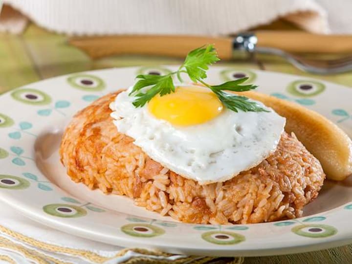 Variations include lentils and tacu-tacu is usually topped with a fried egg or accompanied with breaded or fried meat, fried plantains and onion based salsa criolla.