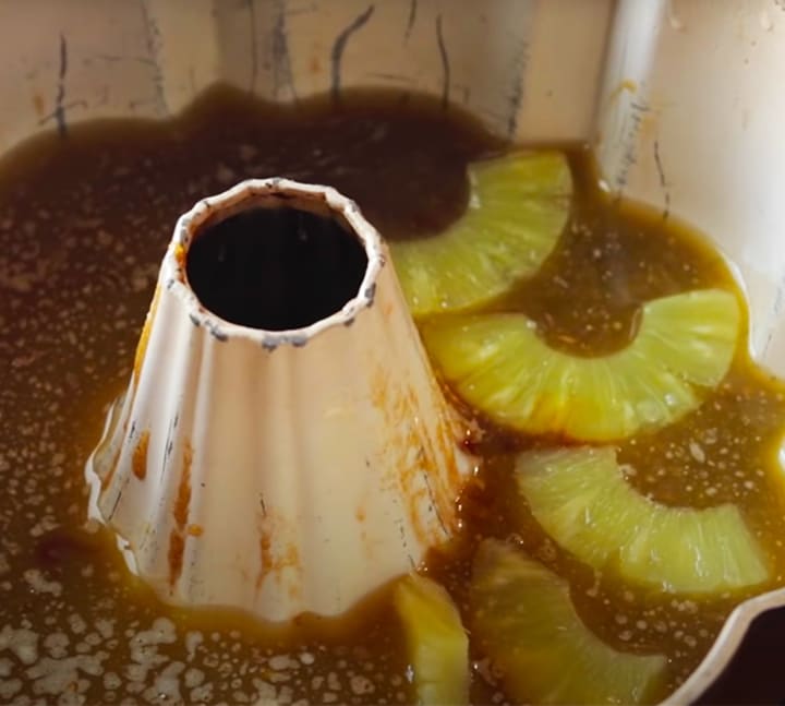 - Pour the hennessy brown sugar butter at the bottom of the bundt pan. Place the pineapple rings simultaneously over the butter mix. Pour the cake mix over the pineapples. Co for 1 hour and 15 minutes. Check by sticking in a toothpick and see if it comes out clean.