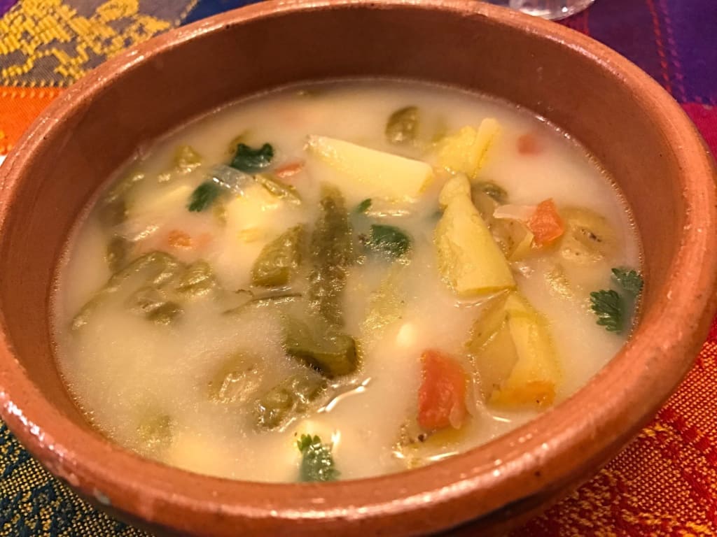 Caldo de queso is a delicious soup that consists of potatoes, green chilies, chicken broth, and cheese. To make this soup creamy a large amount of cheese is added last. The soup is served with corn tortilla chips on the side.