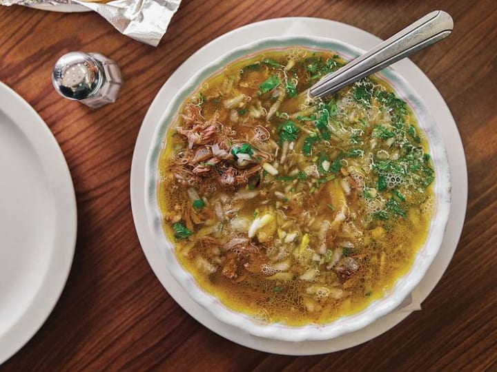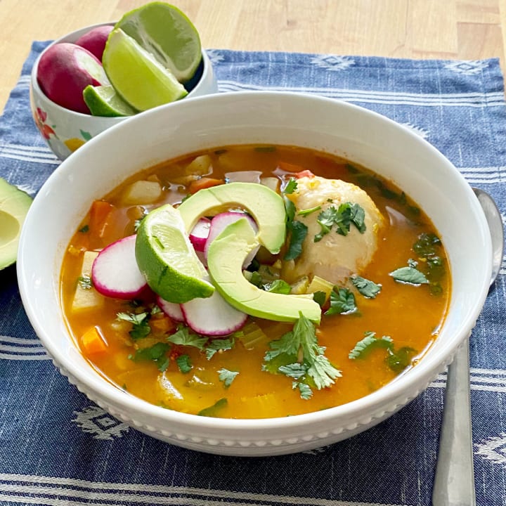 Caldo de pollos it a traditional chicken soup that is made with chicken pieces, rice, potatoes, and chopped vegetables. It includes spices like chili powder and coriander and is often garnished with a dollop of guacamole or avocado wedges. A squeeze of lemon juice or hot sauce can be added to the soup.