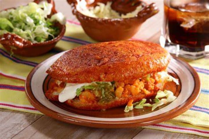 Pambazo means two things Mexican bread and a sandwich made with the bread. The bread is usually dipped in a spicy, pepper-onion-garlic sauce called guajillo to give it a bright orange color. The sandwich is filled with potatoes, refried beans, avocado slices, chicken, and chorizo sausage. It is very popular in Puebla and Veracruz and can be served with a salad on the side.