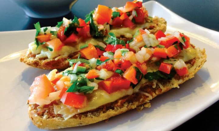Mollete is a sandwich from northern Mexico. The base is a halved bolillo bread roll topped with refried beans, cheese, and tomato salsa. It is mostly a breakfast staple.
