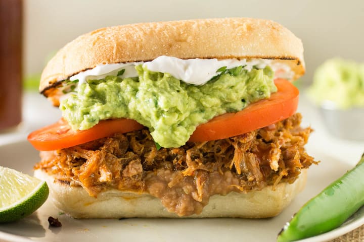 Mexican tortas are traditional sandwiches that are prepared with rolls sliced horizontally, buttered, and filled with beans, avocado, ham, queso, jalapenos, and can include fried beef or chicken or shredded beef or roasted pork.