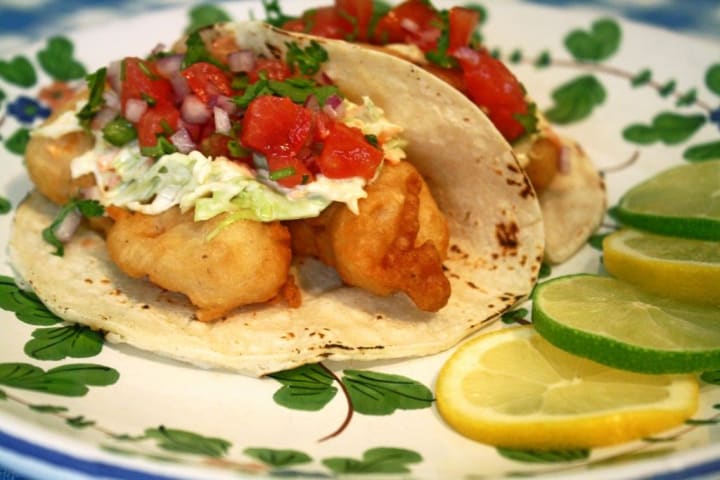 Tacos de pescado or fish tacos originated in Baja California. Corn flour tacos are filled with fried or grilled fish pieces. Then topped with vegetables like cabbage or lettuce and sour cream or mayonnaise.