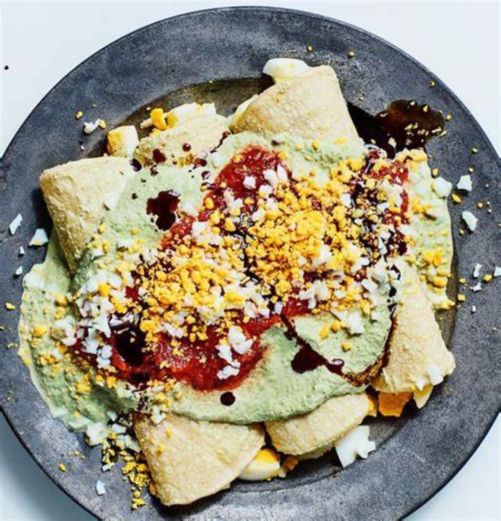 Papadzules have Mayan origins. The tortillas are filled with eggs and drenched in a sauce made with pumpkin seeds and epazote. It is eaten for breakfast and can be topped with hot chilis and pickled onions.