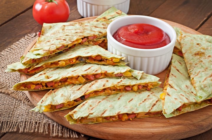 Quesadilla is a Mexican snack that consists of a flour or corn tortilla filled with cheese. It is usually folded in half and can include ingredients like meats, beans, or potatoes. It is then cut into wedges and served with salsa or guacamole. These can be topped with diced tomatoes, onions, lettuce, or hot chilis.